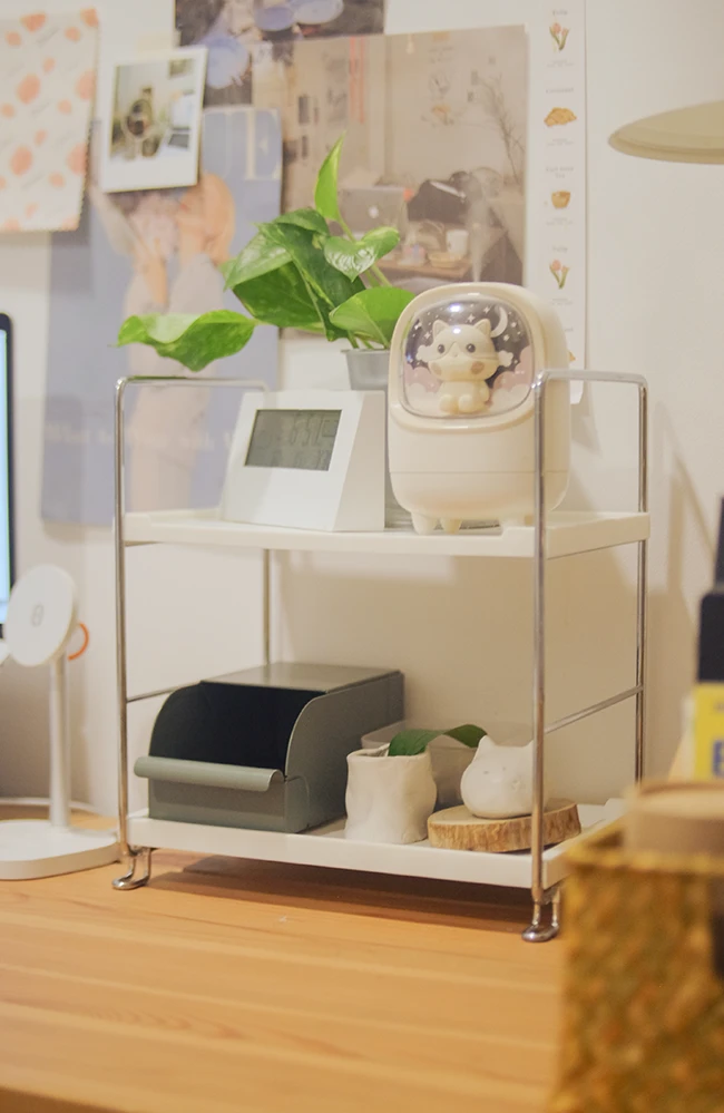ชั้นวางสีขาวตัดกับสแตนเลส เหมาะกับวางของกระจุกกระจิกบนโต๊ะ ไม่ว่าจะวางเครื่องเขียนบนโต๊ะทำงาน หรือน้ำหอมเครื่องสำอางบนโต๊ะเครื่องแป้งก็ได้