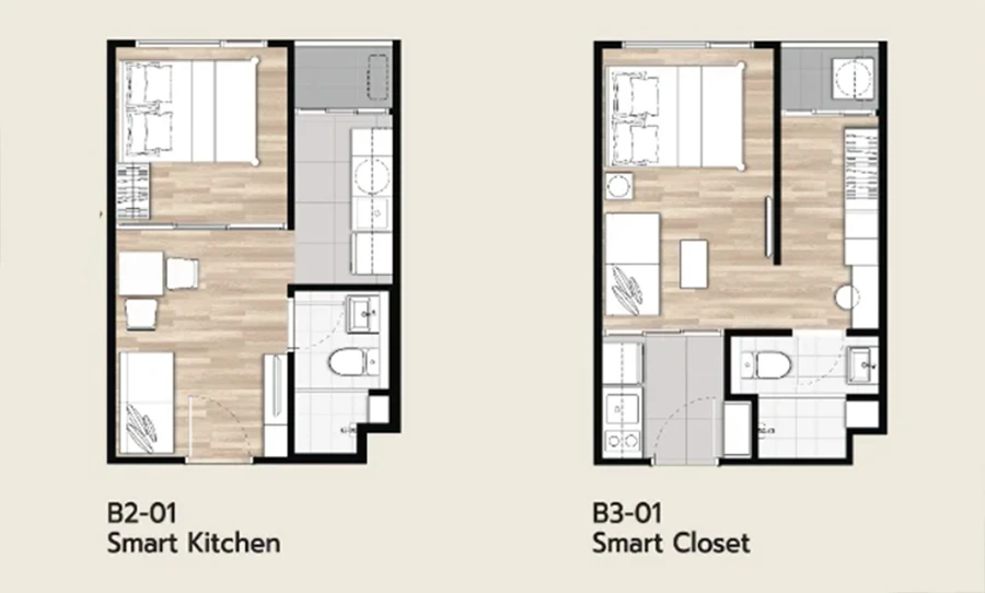 1 ห้องนอนในขนาดเดียวกันก็จะมี 2 แบบให้เลือก คือแบบ Smart Kitchen สำหรับคนชอบทำอาหาร