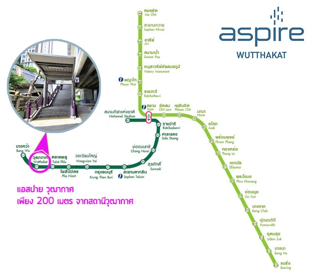 แผนที่ แอสปาย วุฒากาศ (Aspire wutthakat) คลิกเพื่อดูภาพใหญ่ ถึงแม้ว่าเส้นทางเดินรถแถวนั้นจะค่อนข้างซับซ้อนซักหน่อยสำหรับคนนอกพื้นที่ฝั่งธนบุรีก็ตาม แต่ด้วยระยะห่างจากสถานีรถไฟฟ้าสถานีวุฒากาศ เพียง 200 เมตร ติดริมถนนใหญ่วุฒากาศ เป็นที่ตั้งของโครงการคอนโด Low Rise "Aspire วุฒากาศ" เติมเต็มความสุขรอบด้าน ด้วยความร่มรื่นของสวนสวยและสระว่ายน้ำ panoramic view ท่ามกลางความเป็นส่วนตัวเพียง 166 ยูนิต บนทำเลที่คุ้นเคย ซึ่งบริเวณโดยรอบโครงการนั้นค่อนข้างจะคึกคัก มีทั้งตลาดเช้าซึ่งห่างออกไปอีกประมาณ 3 ซอย เต็มไปด้วยร้านค้า ร้านอาหาร ร้านสะดวกซื้อ จัดว่าอุดมสมบูรณ์ไม่แห้งแล้งแน่นอน อีกทั้งฝั่งตรงข้ามโครงการ มีโรงเรียนอำนวยศิลป์ตั้งอยู่ในซอยวุฒากาศ 16 ในรัศมีที่ไกลออกไปอีกหน่อยก็มีทั้งห้างเดอะมอลล์ท่าพระ โรงพยาบาลพญาไท 3 และมหาวิทยาลัยสยามอีกด้วย สิ่งที่ตามมากับแหล่งชุมชนก็คือตลาดและวัดที่ยังคงรักษาความดั้งเดิมอันอบอุ่นเรียบง่ายไว้ได้เป็นอย่างดี จากทำเลที่ดีแบบนี้ มีทั้งสาธารณูปโภคโดยรอบที่เพียบพร้อมครบถ้วน น่าอยู่อาศัยเป็นอย่างยิ่ง