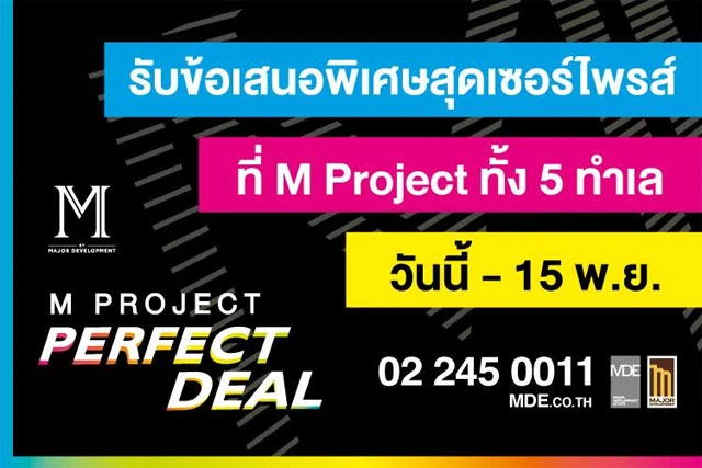 บริษัท เมเจอร์ ดีเวลลอปเม้นท์ จำกัด (มหำชน) ผู้พัฒนาคอนโดมิเนียมระดับไฮเอนด์ จัดโปรโมชั่นสุดพิเศษสำหรับผู้ที่กำลังมองหาคอนโดมิเนียม ทั้งเพื่อการอยู่อาศัย และเพื่อการลงทุน กับงาน "M PROJECT PERFECT DEAL (เอ็ม โปรเจ็ค เพอร์เฟค ดีล)" พบข้อเสนอพิเศษที่คุณจะปฏิเสธไม่ลง กับคอนโดมิเนียมทั้ง 5 ทำเลที่พร้อมให้คุณเป็นเจ้าของแล้ว ไม่ว่าจะเป็น เอ็ม สีลม (M Silom), เอ็ม พญาไท (M Phyathai), เอ็ม ลาดพร้าว (M Ladprao) ที่พร้อมเข้าอยู่ หรือจะเป็น เอ็ม จตุจักร (M Jatujak) และ เอ็ม ทองหล่อ 10 (M Thonglor Ten) ที่เป็นโครงการใหม่ และอยู่ระหว่างการก่อสร้าง ไม่ว่าคุณจะเลือกทำเลไหน ก็ได้รับข้อเสนอพิเศษไม่แพ้กัน ตั้งแต่วันนี้ ถึง 15 พฤศจิกายนนี้เท่านั้น ที่ Sale office ทั้ง 5 ทำเล