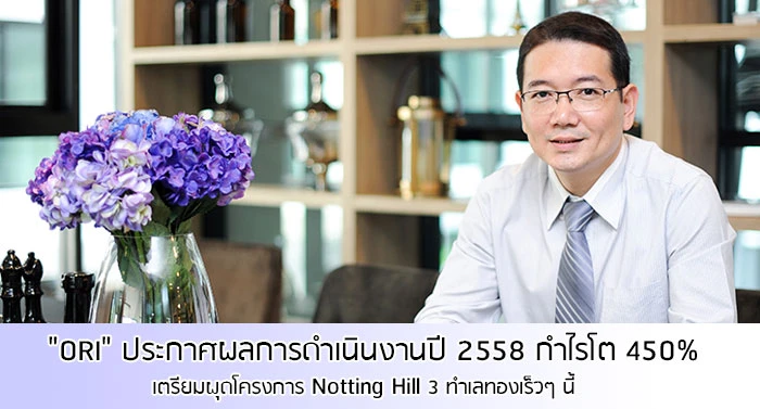 บมจ.ออริจิ้น พร็อพเพอร์ตี้ จำกัด (ORI) ประกาศผลการดำเนินงานปี 2558 สิ้นสุดวันที่ 31 ธันวาคม 2558 มีรายได้รวม 2,055 ล้านบาท เพิ่มขึ้น 267% กำไรสุทธิ 386.5 ล้านบาท เพิ่มขึ้น 450% จากโครงการคอนโดมิเนียมทั้งหมด 25 โครงการ มูลค่า 15,353 ล้านบาท ส่งผลให้ยอดขายรอโอน (Backlog) สิ้นปี มีจำนวน 7,158 ล้านบาท ด้านผู้บริหาร "พีระพงศ์ จรูญเอก" เผยอุตสาหกรรมอสังหาริมทรัพย์ไตรมาส 1/59 ยังคึกได้ เหตุมาตรการกระตุ้นภาคอสังหาฯ ของภาครัฐหนุน เผยเตรียมเปิดโครงการ Notting Hill 3 ทำเล มูลค่ารวมเกือบ 4,000 ล้านบาท