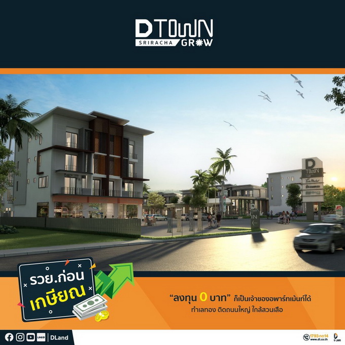 ต่อกันที่โครงการดีทาวน์ โกรว์ สวนเสือ-ศรีราชา อาคารพาณิชย์เพื่อธุรกิจร้านค้าและอพาร์ทเม้นท์ 3 ชั้น ติดหน้าใหญ่ ใกล้แหล่งอำนวยความสะดวกครบครัน โดยให้ราคาดีที่สุด เริ่มต้น 3 ล้านกว่าบาท สนใจลงทุน 0 บาท วันนี้! ก็เป็นเจ้าของอพาร์ทเม้นท์ได้ พร้อมการันตีผู้เช่า และรายได้นานถึง 2 ปี โดยผ่อนเพียง 1,000 บาท/เดือน แถมอุ่นใจ กู้ได้เต็ม 100%  จัดให้ไม่ยั้ง