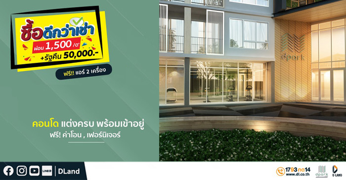 โครงการ ดี พาร์ค คอนโด สวนเสือ-ศรีราชา (D Park Condo Suansear-Sriracha) ตกแต่งครบ พร้อมอยู่ ด้วยราคาเริ่มต้นเพียง 1.5 ล้านบาท ซื้อดีกว่าเช่า! ผ่อนเพียง 1,500 บาท/เดือน และรัฐคืนให้อีก 50,000 บาท ห้ามพลาด สำหรับลูกค้าที่จองวันนี้ จ่ายเพียง 1,000 บาท เข้าอยู่ได้เลย! นอกจากนี้ ยังฟรีค่าโอน เฟอร์นิเจอร์ เครื่องปรับอากาศ และของแถมแบบจุกๆ กันไปเลย อีกทั้งยังเอาใจคนซื้อเพื่อการลงทุน ด้วยการันตีผู้เช่า 1 ปีอีกด้วย