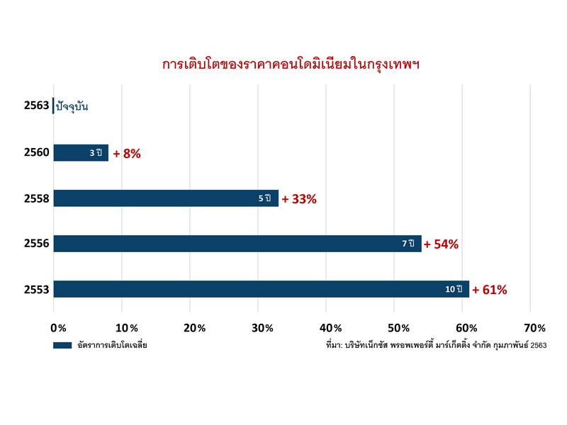 เงินเย็นระยะยาว ราคาคอนโดมิเนียมมีการปรับตัวสูงขึ้นอย่างต่อเนื่องในช่วง 10 ปีที่ผ่านมาอยู่ที่ 61% หรือประมาณ 6 % ต่อปี การลงทุนกับคอนโดมิเนียมเพื่อผลตอบแทนในระยะเวลายาวนั้น นักลงทุนจะไม่ต้องแข่งขันกับเวลาเหมือนการลงทุนระยะสั้น ซึ่งช่วงเวลาในการถือครองที่ดีที่สุดควรจะอยู่ที่ 3 - 5 ปี แล้วจึงขายต่อ หรือขายพร้อมผู้เช่า ขึ้นอยู่กับการบริหารจัดการของคอนโดมิเนียม ที่ทำให้สภาพความเป็นอยู่ ยังดีอยู่หรือไม่ และราคามูลค่าคอนโดมิเนียมจะปรับขึ้นทุกปีตามราคาที่ดินกับความเจริญในพื้นที่ที่เพิ่มขึ้นอย่างเห็นได้ชัด และตัวโครงการยังอยู่ในสภาพที่ดีสามารถขายต่อได้ง่ายอีกด้วย