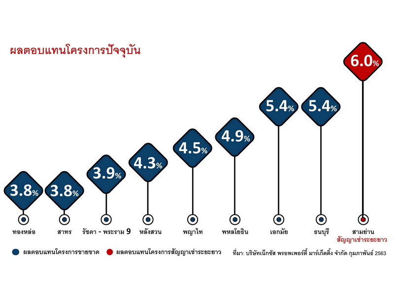 ผลตอบแทนคงที่ต่อเนื่อง เทรนด์การลงทุนยุคใหม่ต้องมองหาอสังหาฯ ที่มีผลตอบแทนที่คงที่และมีมูลค่าเพิ่มอย่างต่อเนื่อง ทำให้นักลงทุนได้รายได้เป็นประจำทุกเดือนซึ่งอาจไม่ใช่ผลตอบแทนที่สูงที่สุด อัตราผลตอบแทนจากการปล่อยเช่าคอนโดมิเนียมจะอยู่ระหว่าง 3 - 6% ขึ้นอยู่กับราคาซื้อและค่าเช่าในแต่ละทำเล โดยทำเลสามย่าน คอนโดมิเนียม โครงการสัญญาเช่าระยะยาว (Leasehold) มีอัตราผลตอบแทนสูงสุดที่ 6.0% ต่อปี ในขณะที่ทำเลทองหล่อ และสาทร อยู่ที่ 3.8% ทั้งนี้ ผลตอบแทนต่อปีจากโครงการคอนโดมิเนียมให้เช่าระยะยาวจะสูงกว่า