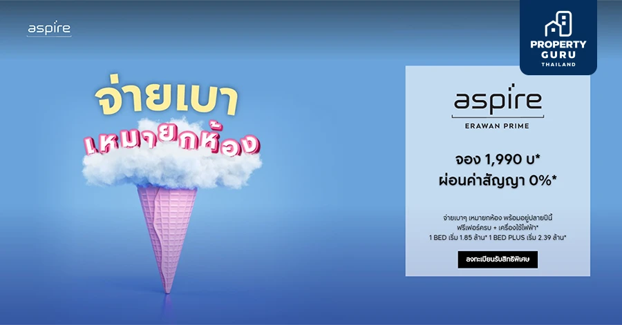 "แอสปาย เอราวัณ ไพร์ม (Aspire Erawan Prime)" โปรเหมา เหมา จ่ายเบาๆ เหมายกห้อง พร้อมอยู่ปลายปีนี้ จอง 1,990 บ.* ผ่อนค่าสัญญา 0% นาน 6 เดือน* ฟรีเฟอร์ครบ + เครื่องใช้ไฟฟ้า*