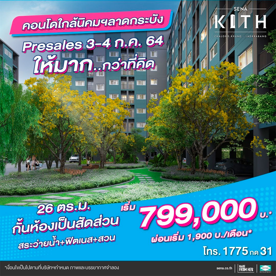 เสนา คิทท์ ฉลองกรุง - ลาดกระบัง (Sena Kith Chalong Krung-Ladkrabang) ตั้งแต่วันที่ 19 มิ.ย. 64 ที่ผ่านมา วางแผนเตรียมเปิดขายรอบ Presale ในวันที่ 3-4 ก.ค. นี้ ราคาพิเศษ เริ่มเพียง 799,000 บาท* พร้อมเฟอร์ครบ + เครื่องใช้ไฟฟ้า* ส่วนกลางครบ ลิฟต์ สระว่ายน้ำ ฟิตเนส คลับเฮ้าส์ ..ให้คุ้มเกินคาด! ผ่อนสบายๆ เริ่ม 1,900 บาท/เดือน*