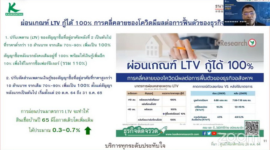 สำหรับในปี 2565 ตลาดอสังหาริมทรัพย์มีแนวโน้มปรับตัวดีขึ้นเนื่องจากมีปัจจัยหนุน อาทิ สถานการณ์การแพร่ระบาดของโควิด-19 ดีขึ้น เศรษฐกิจเริ่มกลับมาขับเคลื่อนอีกครั้ง ตลอดจนมาตรการผ่อนคลาย LTV ของธปท.สำหรับที่อยู่อาศัยหลังที่ 2 เป็นต้นไป จากเดิม 70-90% เป็น 100% ขณะที่ในสัญญาซื้อหลังแรกยังคงเดิมอยู่ที่ 100% พร้อมให้เงินกู้เพิ่มอีก 10% เพื่อใช้ในการซื้อเฟอร์นิเจอร์ (รวม 110% ของมูลค่าหลักประกัน) โดยมีผลบังคับใช้ถึง 31 ธ.ค.2565 จะเป็นการช่วยกระตุ้นตลาดอสังหาริมทรัพย์ได้เป็นอย่างดี ทำให้คาดการณ์ได้ว่าตลาดสินเชื่อบ้านปี 2565 จะมีอัตราการเติบโตประมาณ 0.3-0.7% แต่ก็ต้องระมัดระวังเรื่อง Supply ที่อยู่อาศัยรอขายสะสมกว่า 4 แสนหน่วย และภาวะการฟื้นตัวทางเศรษฐกิจของภาคครัวเรือนยังอยู่ในภาวะเปราะบาง