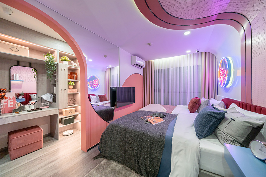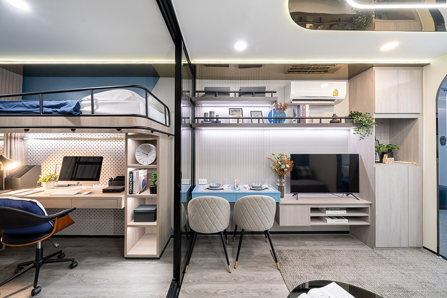 Brixton Kaset Sriracha Campus มีฟังก์ชันห้องชุดให้เลือกถึง 3 แบบตกแต่งแบบ Fully Fitted ประกอบด้วย DORMITORY Type ขนาด 23.60 – 24.50 ตารางเมตร, SMART CLOSET Type ขนาด 26.00 – 27.40 ตารางเมตร และ GANGSTER SUITE Type ขนาด 32.10 – 33.10 ตารางเมตร