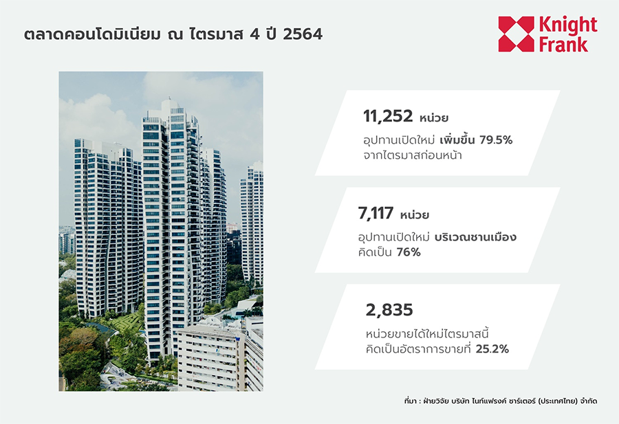 นายสัญชัย คูเอกชัย ผู้อำนวยการและหัวหน้าส่วนงานวิจัยและที่ปรึกษา บริษัท ไนท์แฟรงค์ ประเทศไทย จำกัด กล่าวว่า มีอุปทานคอนโดมิเนียมมากขึ้นในไตรมาสสุดท้ายของปี 64 จากเดิมที่มีการชะลอตัวการเปิดโครงการใหม่ในช่วงไตรมาส 1 – 3 ของปี เนื่องจากรัฐบาลผ่อนคลายและยกเลิกมาตราการล็อคดาวน์ พร้อมทั้งเปิดประเทศต้อนรับนักท่องเที่ยวโดยเฉพาะในรูปแบบ Test & Go อีกทั้งธนาคารแห่งประเทศไทยมีผ่อนปรนมาตราการ LTV เป็นการชั่วคราวจนถึงสิ้นปี 2565 นักพัฒนาจึงมองว่าเป็นช่วงเวลาที่เหมาะสมสำหรับการเปิดโครงการใหม่ โดยเป็นการเปิดที่เน้นจับกลุ่มเรียลดีมานด์ที่เป็นกำลังซื้อหลักในเวลานี้เท่านั้น