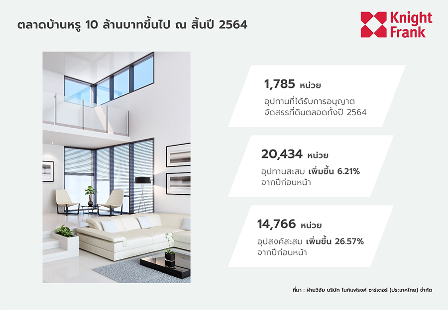 ณ สิ้นปี 2564 พบว่าบ้านระดับราคาตั้งแต่ 10 ล้านบาทขึ้นไปที่ยังมีหน่วยเหลือขายอยู่ในปัจจุบันประมาณ 197 โครงการ มีอุปทานสะสมจำนวนทั้งสิ้น 20,434 หน่วย และมีจำนวนหน่วยขายได้ไปทั้งสิ้น 14,766 หน่วย คิดเป็นอัตราการขาย 72% โดยอัตราการขายช่วงสิ้นปี 2564 มีอัตราการขายเพิ่มสูงขึ้นมา 11% เมื่อเทียบจากปีก่อนหน้าที่ 61%