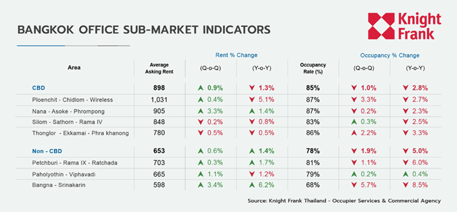 ราคาเช่าโดยเฉลี่ยในย่านศูนย์กลางธุรกิจ (CBD) ปรับเพิ่มขึ้น 0.9% ไตรมาสต่อไตรมาส เป็น 898 บาท/ ตร.ม./ เดือน แต่ยังคงลดลง 1.3% ปีต่อปี เขตนานา-อโศก-พร้อมพงษ์เป็นพื้นที่เดียวที่ค่าเช่ามีการเติบโตทั้งแบบรายไตรมาสและรายปี โดยเพิ่มขึ้นเป็น 905 บาท/ ตร.ม./ เดือน