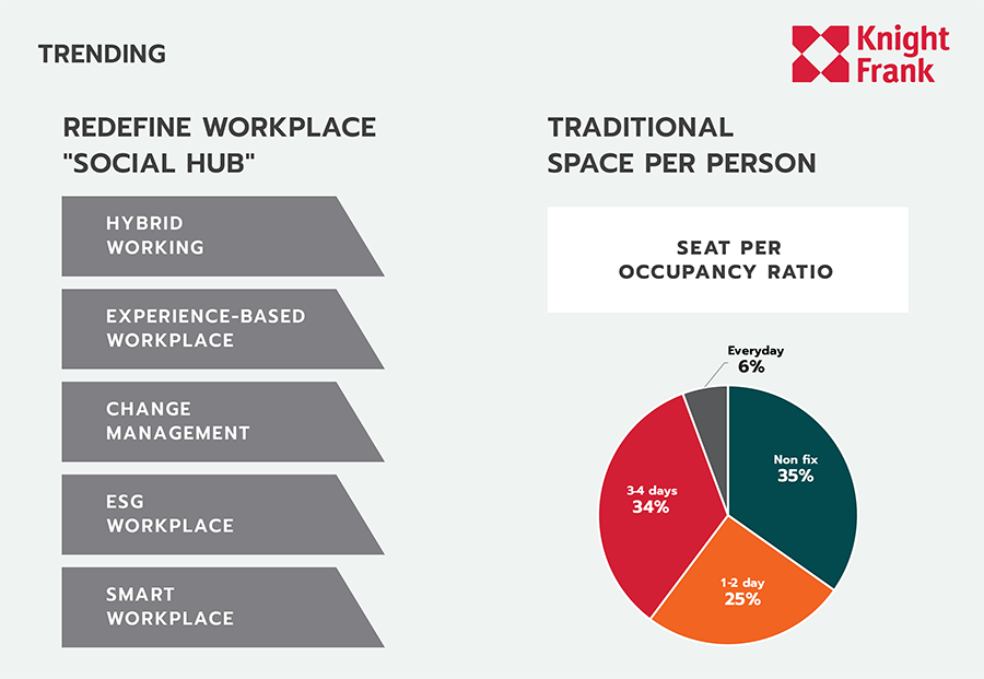 นายอายุธพร บูรณะกุล กรรมการบริหารและหัวหน้าฝ่ายกลยุทธ์พื้นที่สำนักงานและการบริหารโครงการ บริษัท ไนท์แฟรงค์ ประเทศไทย จำกัด กล่าวว่า “Social Hub หรือ ศูนย์กลางพบปะร่วมงาน” จะเป็นนิยามใหม่ของพื้นที่ทำงาน เพื่อรองรับรูปแบบการทำงานแบบ Hybrid Model และ SMART Workplace ที่นำเทคโนโลยีมาใช้ในการบริหารประสบการณ์และพื้นที่ทำงานมากขึ้น