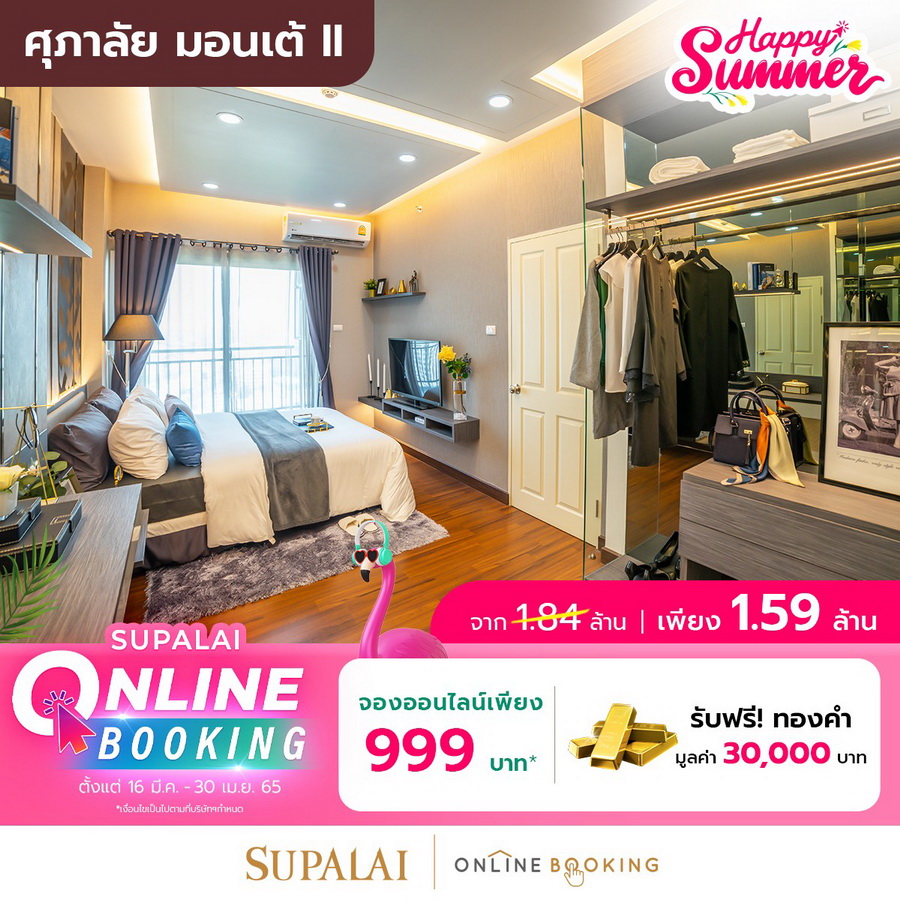 ศุภาลัย มอนเต้ II ลดจุกๆทันที 250,000 บาท ราคาพิเศษสุดๆ เริ่ม 1.59 ล้านบาท จองออนไลน์ทุกยูนิต เพียง 999 บาท* รับฟรี! ทองคำ มูลค่า 30,000 บาท* รีบจองด่วน ตั้งแต่วันที่ 16 มีนาคม - 30 เมษายน 2565 นี้ เท่านั้น!! จองผ่านออนไลน์ Online Booking ได้ที่