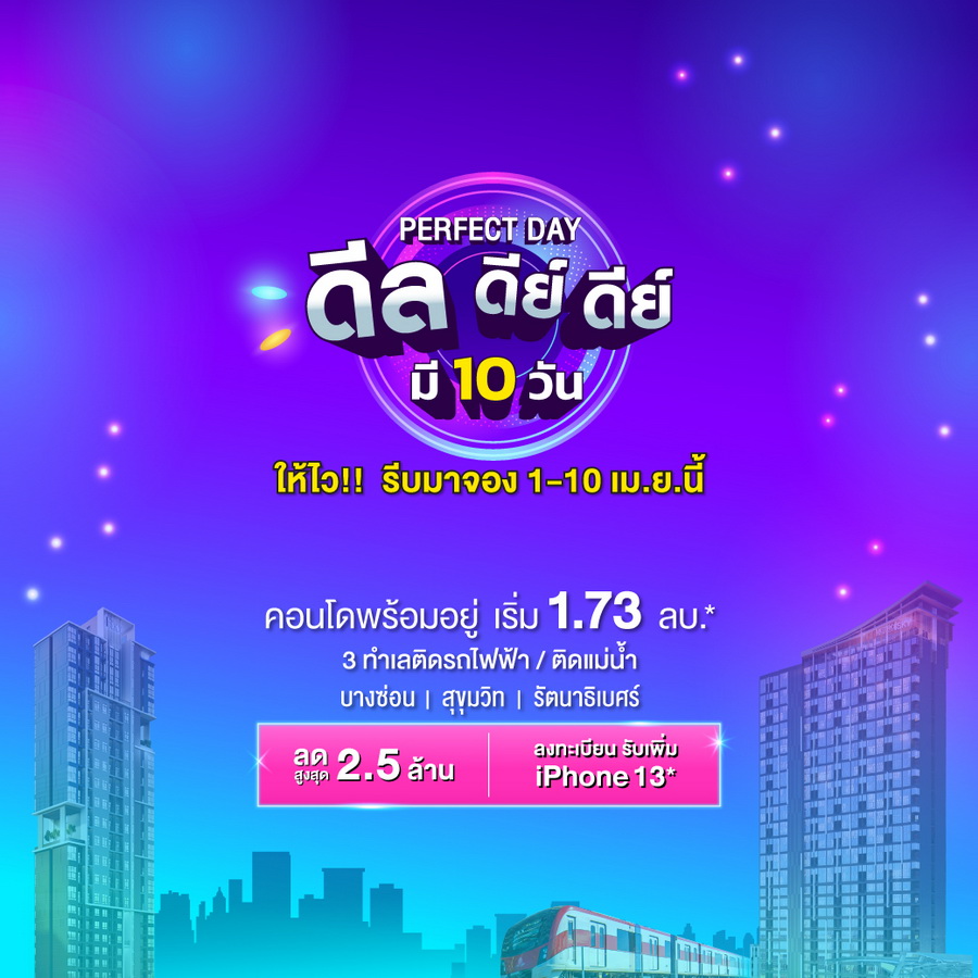 #PERFECTDAY ดีล ดีย์ ดีย์ มี 10 วัน 1-10 เม.ย.นี้เท่านั้น ลดสูงสุด 2.5 ล้านบาท* คอนโดพร้อมอยู่ เริ่ม 1.73 ล้านบาท* 3 ทำเล ติดรถไฟฟ้า /ติดแม่น้ำ บางซ่อน l สุขุมวิท l รัตนาธิเบศร์