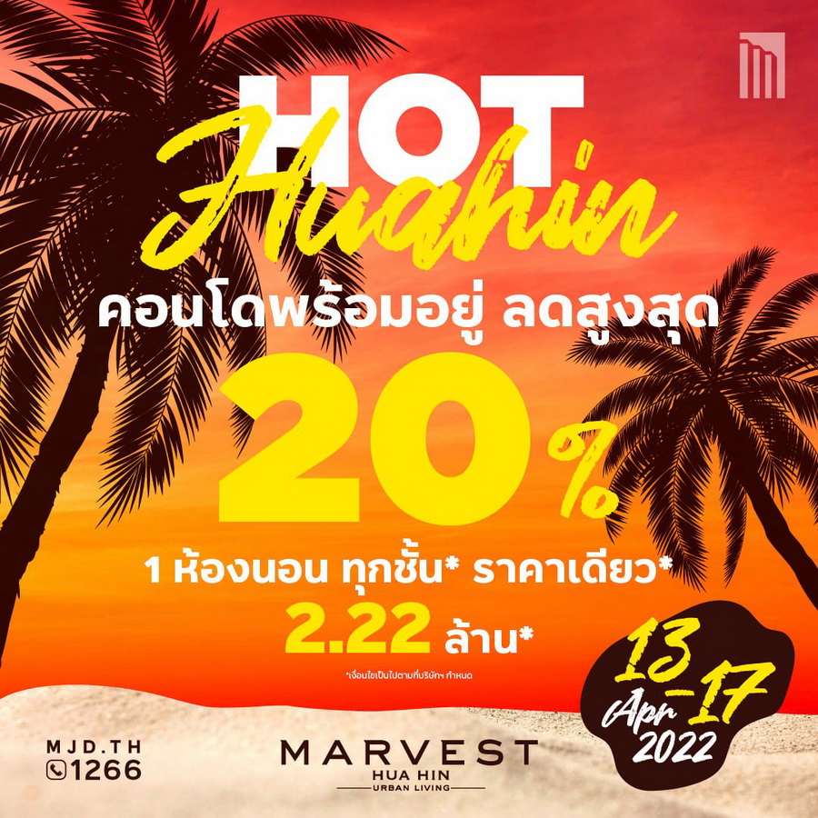 MARVEST Huahin (มาร์เวสท์ หัวหิน) จัดโปรแรงต้อนรับซัมเมอร์นี้ ลดสูงสุด 20% พบกัน 13-17 เมษา นี้ ลงทะเบียนรับข้อเสนอพิเศษก่อนใคร