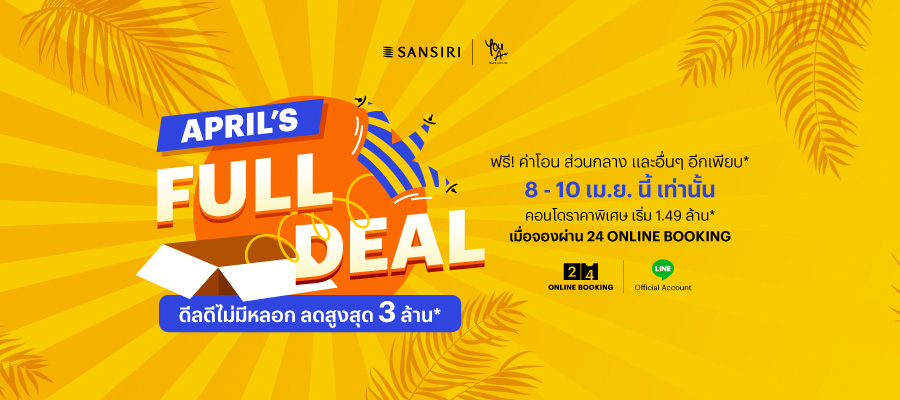 April's Full Deal ดีลดีไม่มีหลอก ลดสูงสุด 3 ล้าน* โปรพิเศษรับหน้าร้อนอีกเพียบ! กับ 11 คอนโดราคาพิเศษจากแสนสิริ เมื่อจองผ่าน 24 Online Booking เริ่ม 1.49 ล้าน* 8 - 10 เมษายน 2565 นี้ กับ 11 คอนโดราคาพิเศษ