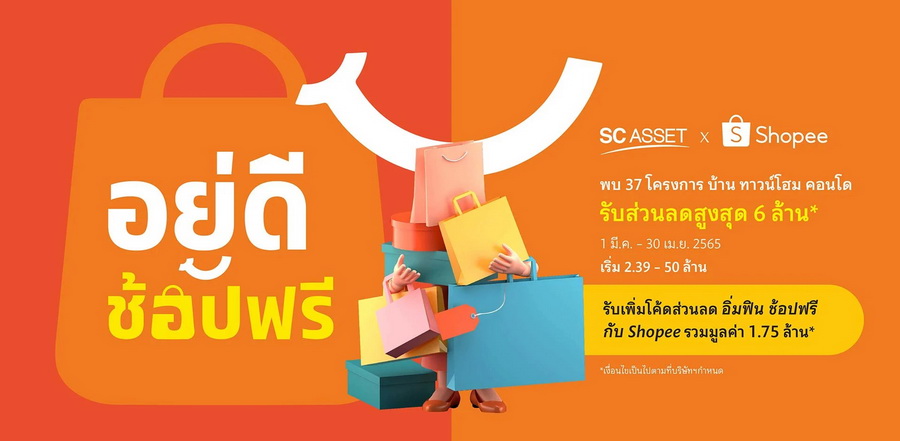 SC ASSET จับมือ SHOPEE ร่วมส่งมอบคุณภาพชีวิตดีๆ แบบ “อยู่ดี” และ “ช้อปฟรี” ให้คุณถึงบ้าน "อยู่ดีช้อปฟรี" รับส่วนลดสูงสุด 6 ล้าน* รับเพิ่ม! โค้ดส่วนลด อิ่มฟิน ช้อปฟรี กับ SHOPEE รวมมูลค่า 1.75 ล้าน* พบ 37 โครงการ บ้าน ทาวน์โฮม คอนโด บนทำเลศักยภาพ เริ่ม 2.39-50 ล้าน ตั้งแต่วันที่ 1 มีนาคม - 30 เมษายน 2565 นี้เท่านั้น