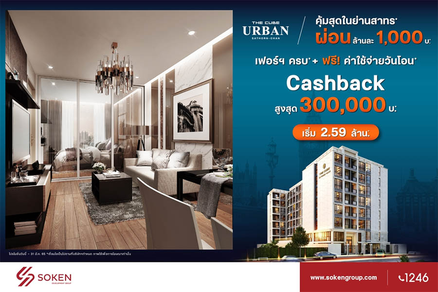 The Cube Urban Sathorn-Chan (เดอะคิวบ์ เออร์เบิน สาทร-จันทน์) คอนโดมิเนียมสไตล์อังกฤษโลว์ไรส์ (Low rise) สูง 8 ชั้น 1 อาคาร ตั้งอยู่ในทำเลศักยภาพ CBD (Central business district) ถนนจันทน์ซอย 51 เชื่อมถนนสาทร ใกล้รถไฟฟ้าและทางด่วน พร้อมโอนกรรมสิทธิ์ทั้งอยู่อาศัยเองและเพื่อลงทุนฯ มอบดีลพิเศษคุ้มสุดในย่านสาทร ให้ผ่อนเพียงล้านละ 1,000 บาท รับ Cashback สูงสุด 3 แสนบาท ฟรี ค่าใช้จ่ายวันโอนฯ ราคาเริ่มต้น 2.59 ล้าน* ผ่อนล้านละ 1,000 บาท*