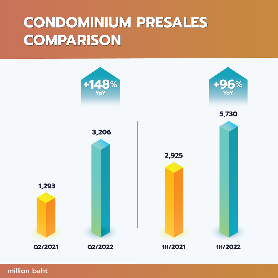 นายไตรเตชะ ตั้งมติธรรม กรรมการผู้จัดการ บริษัท ศุภาลัย จำกัด (มหาชน) เปิดเผยว่า ในปี 2565บริษัทฯ เริ่มมองเห็นการฟื้นตัวที่ดีขึ้นของตลาดคอนโดมิเนียม จึงได้มีการวางแผน ปรับกลยุทธ์ด้านการตลาด จัดโปรโมชันทุกไตรมาสเพื่อกระตุ้นยอดขายในกลุ่มคอนโดฯ สร้างเสร็จพร้อมเข้าอยู่ (Ready to Move in) กว่า 30 โครงการทั่วประเทศ รวมถึงการเพิ่มช่องทางการจองผ่าน Online Booking ให้สอดคล้องกับเทรนด์การซื้อที่อยู่อาศัยของลูกค้าในปัจจุบัน โดยลูกค้าสามารถรับข้อเสนอส่วนลด เฟอร์นิเจอร์ของแถม และฟรีค่าใช้จ่ายต่างๆ เพื่อเป็นตัวเลือกเพิ่มโอกาสในการตัดสินใจซื้อของลูกค้าได้มากขึ้น และส่งผลให้ยอดขายคอนโดฯ ของ บมจ.ศุภาลัย ในปีนี้ ประสบความสำเร็จเกินคาด โดยในช่วงไตรมาส 2/2565 มียอดขายสะสมทะยานพุ่งไปกว่า 148 % คิดเป็นมูลค่า 3,206 ล้านบาท เติบโตจากช่วงเดียวกันของปี 2564 ส่งผลให้ในครึ่งปีแรก บริษัทฯ สามารถกวาดยอดขายสะสมไปได้ 5,730 ล้านบาท เติบโตขึ้น 96 % เมื่อเทียบจากช่วงเดียวกันของปี 2564