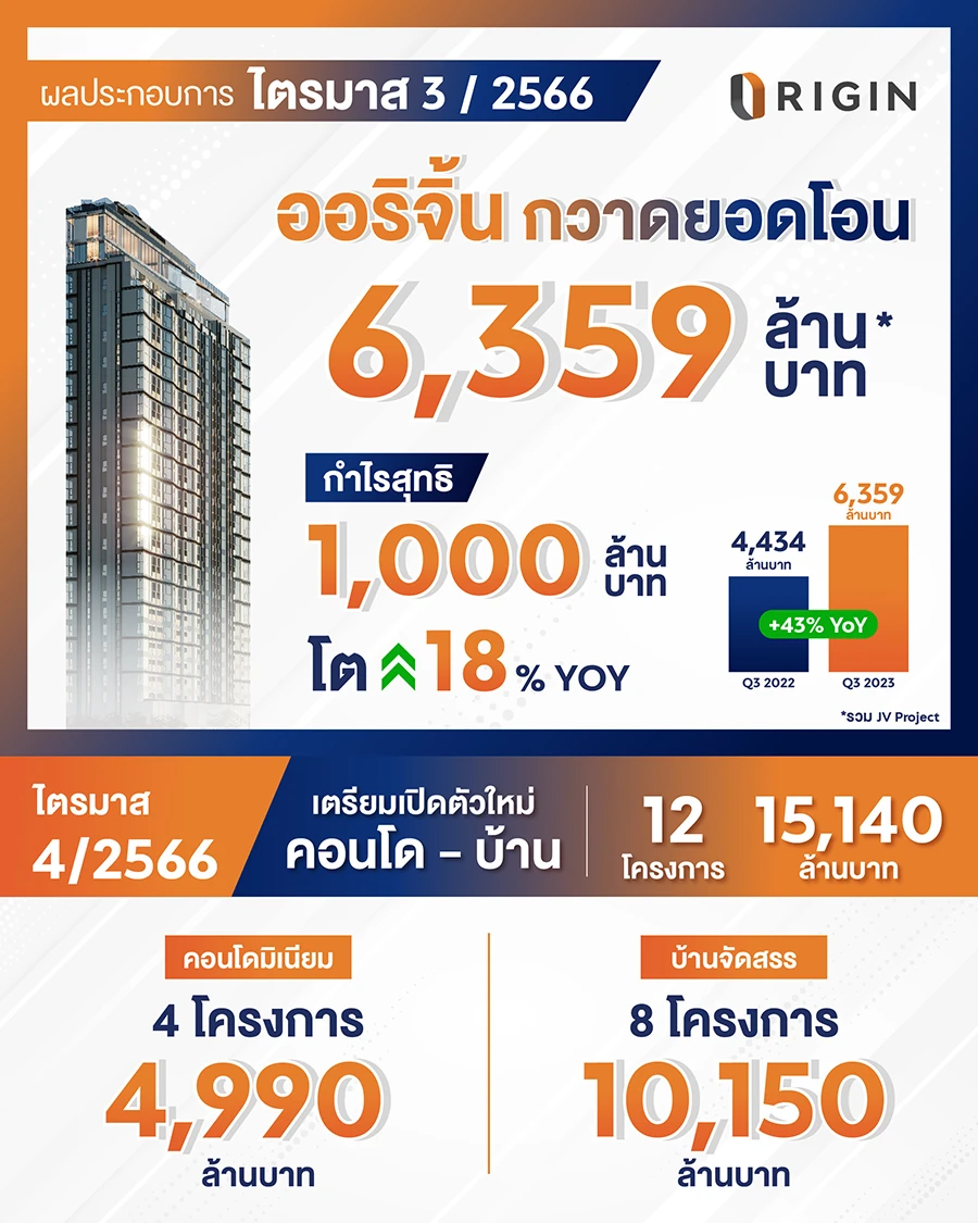 ออริจิ้น กวาดยอดโอน Q3/2566 ทะลุ 6,300 ล้าน พร้อมกำไรกว่า 1,000 ล้าน โต 18% เตรียมเปิดบ้าน-คอนโดใหม่อีก 12 โครงการ มูลค่ารวมกว่า 15,000 ล้าน