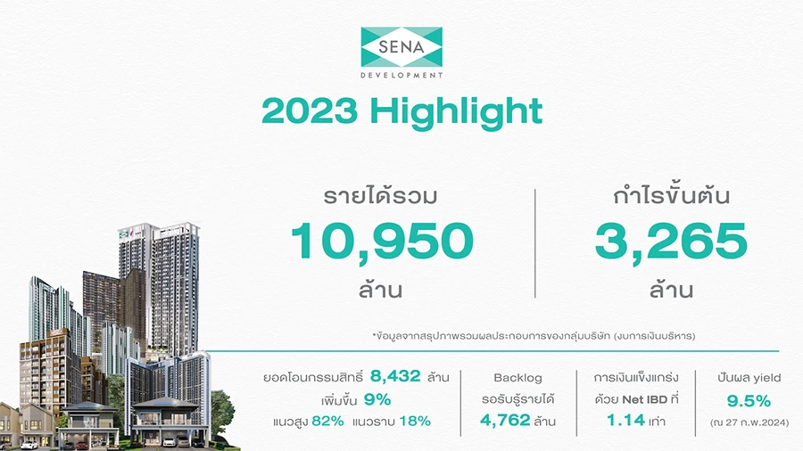 นางสาวอธิกา กล่าวในรายละเอียดว่า สำหรับธุรกิจอสังหาริมทรัพย์ กลุ่มเสนาได้มีการวางกลยุทธ์ชัดเจนในด้านกำหนดราคาขายที่เป็นไปตามสถานการณ์ทางเศรษฐกิจ และสามารถบริหารต้นทุนขายได้อย่างมีประสิทธิภาพ มียอดขาย Pre-sale อยู่ที่ 10,577 ล้านบาท และเป็นยอดโอนกรรมสิทธิ์รับรู้รายได้ 8,432 ล้านบาท แบ่งเป็นโครงการแนวสูง 82% และโครงการแนวราบ 18% เพิ่มขึ้น 699 ล้านบาท หรือ 9% เมื่อเทียบกับปีก่อนหน้า นอกจากนี้ ยังมียอดขายที่รอการรับรู้รายได้ (Back Log) คิดเป็นมูลค่ารวม 4,762 ล้านบาท ณ สิ้นปี 2566