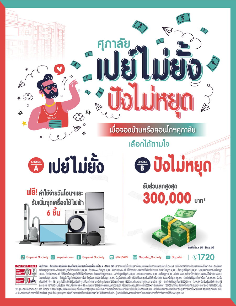 ศุภาลัย ระเบิดโปรฯแรงรับปี 65 "เปย์ไม่ยั้ง ปังไม่หยุด" ฟรีโอน เครื่องใช้ไฟฟ้า หรือรับส่วนลดสูงสุด 3 แสนบาท!
