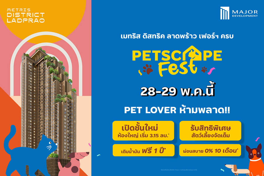 เมเจอร์ ดีเวลลอปเม้นท์ ผู้นำอันดับ 1  ในตลาดคอนโดมิเนียมเลี้ยงสัตว์ได้ (Pet-Friendly Residences) ขอเชิญชวนเหล่า Pet Lover ร่วมมหกรรมที่คนรักสัตว์ไม่ควรพลาด!! “Petscape Fest @Metris District Ladprao” มอบสิทธิพิเศษเพื่อเจ้าของและสัตว์เลี้ยงแบบจัดเต็ม ตอบโจทย์ #สุขเท่าเทียม สุขทั้งเจ้าของ น้องก็สุขด้วย เปิดจองชั้นใหม่ ของคอนโดที่รวมความเป็นที่สุดย่านห้าแยกลาดพร้าว ฟรี Home Automation ให้เฟอร์นิเจอร์ครบทั้งห้อง