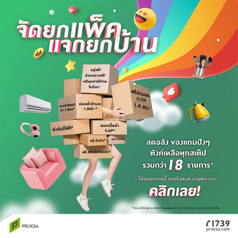 พฤกษาจัดให้ต้อนรับวันแรงงาน ดอลังเกินล้าน กว่า 100 โครงการจากพฤกษา "จัดยกแพ็ค แจกยกบ้าน" รวมกว่า 18 รายการ* บ้านเดี่ยว ทาวน์โฮม คอนโด เริ่ม 1.29 ล้าน* รับของแถมปัง ตังค์เหลือทุกสเต็ป โปรดีเริ่มแล้ว รีบเลย วันนี้ - 30 มิ.ย. 2565