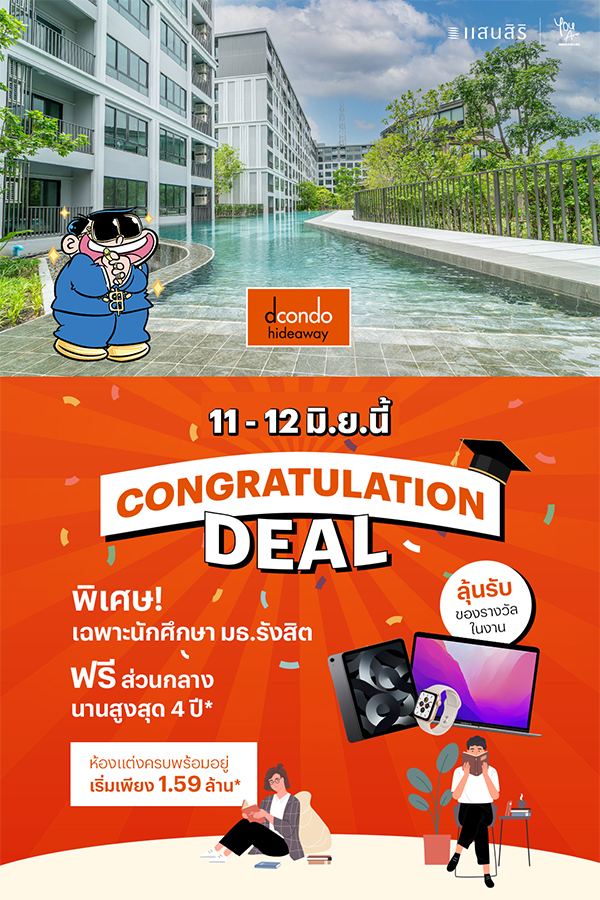 11-12 มิถุนายน 2565 นี้ ดีคอนโด ไฮด์อเวย์ คอนโดใกล้ม.ธรรมศาสตร์ รังสิต มอบ CONGRATULATION DEAL ทุกยูนิตที่จองภายในงาน รับข้อเสนอจัดเต็ม