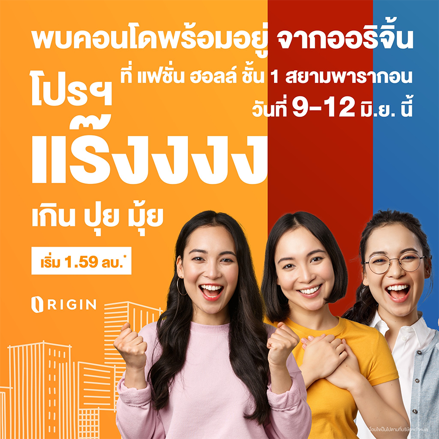 ออริจิ้น ยกทัพ 21 คอนโดพร้อมอยู่ และพรีเซล ทั่ว กทม.-ปริมณฑล และอีอีซี บุกสยามพารากอน 9-12 มิ.ย.นี้ จัดเซอร์ไพรส์สุดยิ่งใหญ่แห่งปี "โปรแร๊ง เกินปุยมุ้ย" จัดหนักส่วนลดสูงสุด 1 ล้านบาท ดาวน์ 0 บาท* ดอกเบี้ย 0%* ในราคาเริ่มต้น 1.59 ล้านบาท พร้อมสิทธิพิเศษ 3 ต่อ เฉพาะผู้จองภายในงานวันที่ 9-12 มิ.ย. นี้ ณ ศูนย์การค้าสยามพารากอน