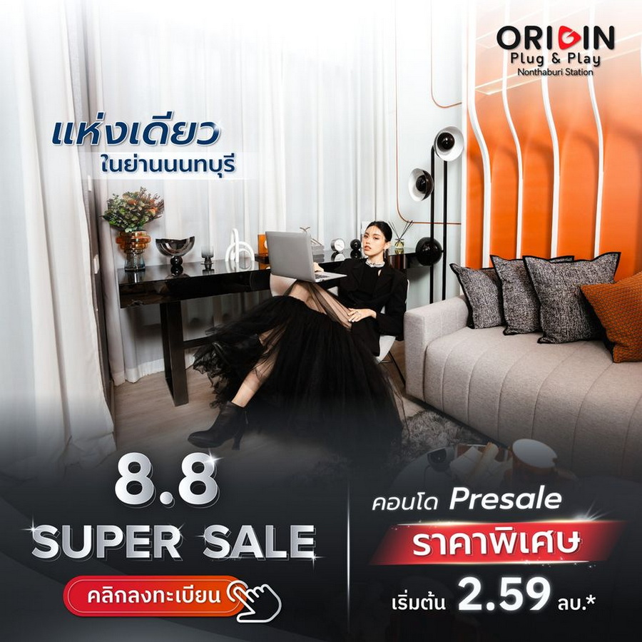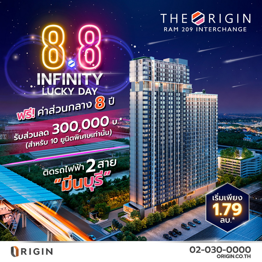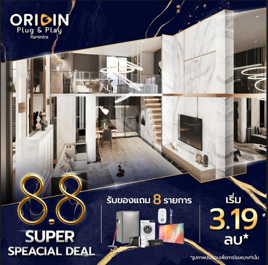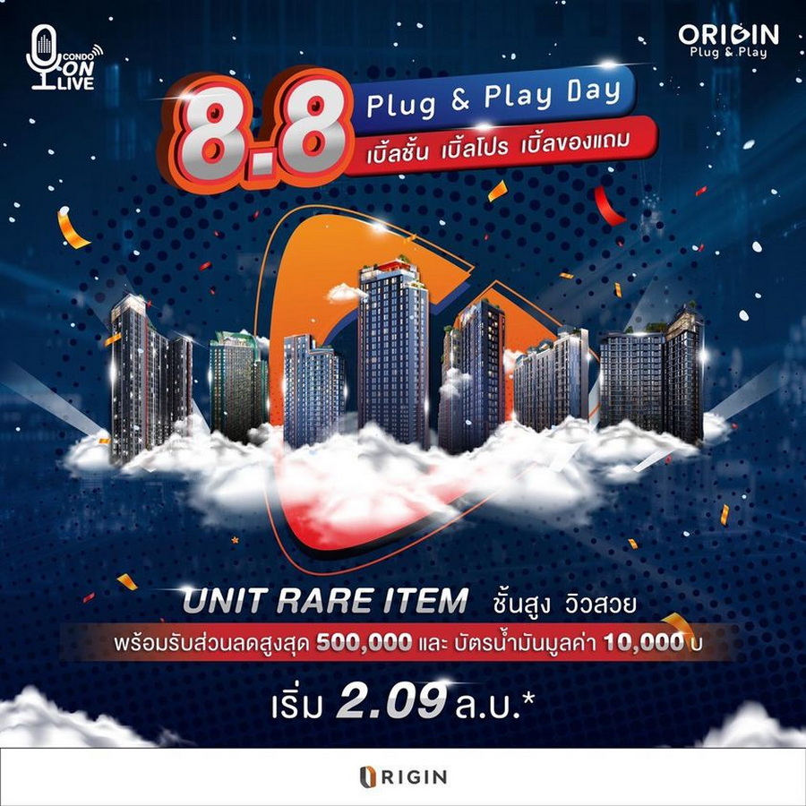 ออริจิ้น พร็อพเพอร์ตี้ จัดแคมเปญ "8.8 PLUG & P(L)AY DAY" เตรียมพบกับไลฟ์ วันที่ 8 เดือน 8 รวมคอนโด ORIGIN PLUG & PLAY ทุกทำเล พบกับโปรโมชั่นพิเศษ! ห้อง RARE ITEM ชั้นสูง วิวสวย พร้อมส่วนลดพิเศษ รับบัตรเติมน้ำมันมูลค่า 10,000 บาท ออริจิ้น ราคาเริ่มต้น 2.09 ลบ.*