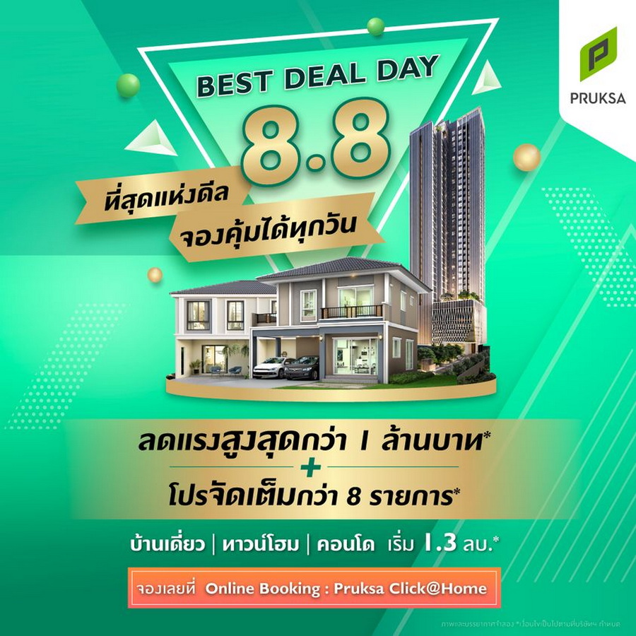 แคมเปญ "8.8 Best Deal Day" ที่สุดแห่งดีล จองคุ้มได้ทุกวันที่ Pruksa Click@Home เมื่อซื้อบ้านเดี่ยว ทาวน์โฮม คอนโด เริ่ม 1.3 ลบ.* รับสิทธิพิเศษ