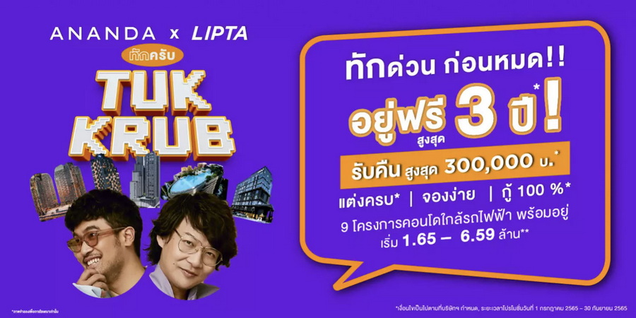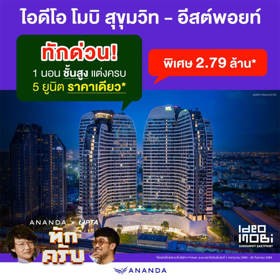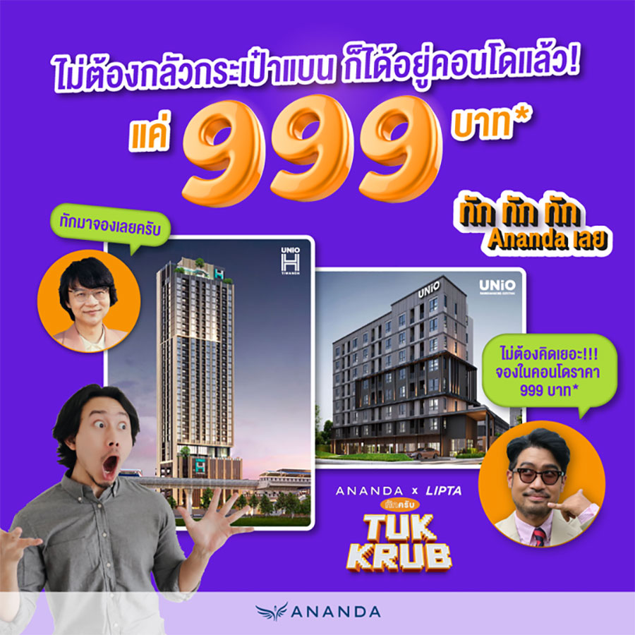 อนันดาปล่อยแคมเปญ "อนันดา ทักครับ!!" กับ 20 โครงการพร้อมอยู่ ภายใต้แบรนด์คุณภาพ ได้แก่ ไอดีโอ โมบิ ไอดีโอ ยูนิโอ อาร์เทล แอริ เอโทล และ ยูนิโอทาวน์ ราคาเริ่มต้น 1.65 - 26 ล้านบาท* ตั้งแต่วันนี้ถึงวันที่ 30 กันยายน 2565 นี้พร้อมเสนอโปรโมชั่นแรง