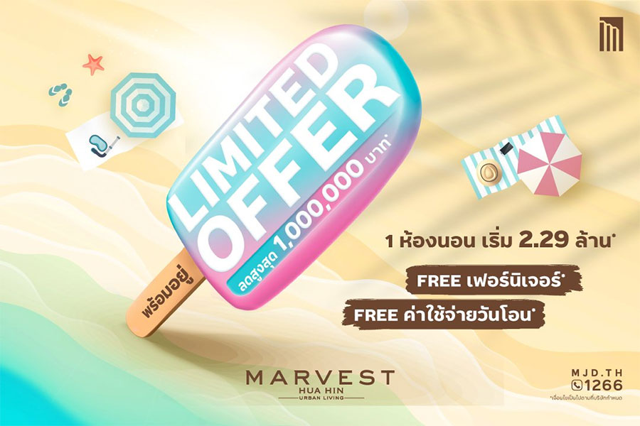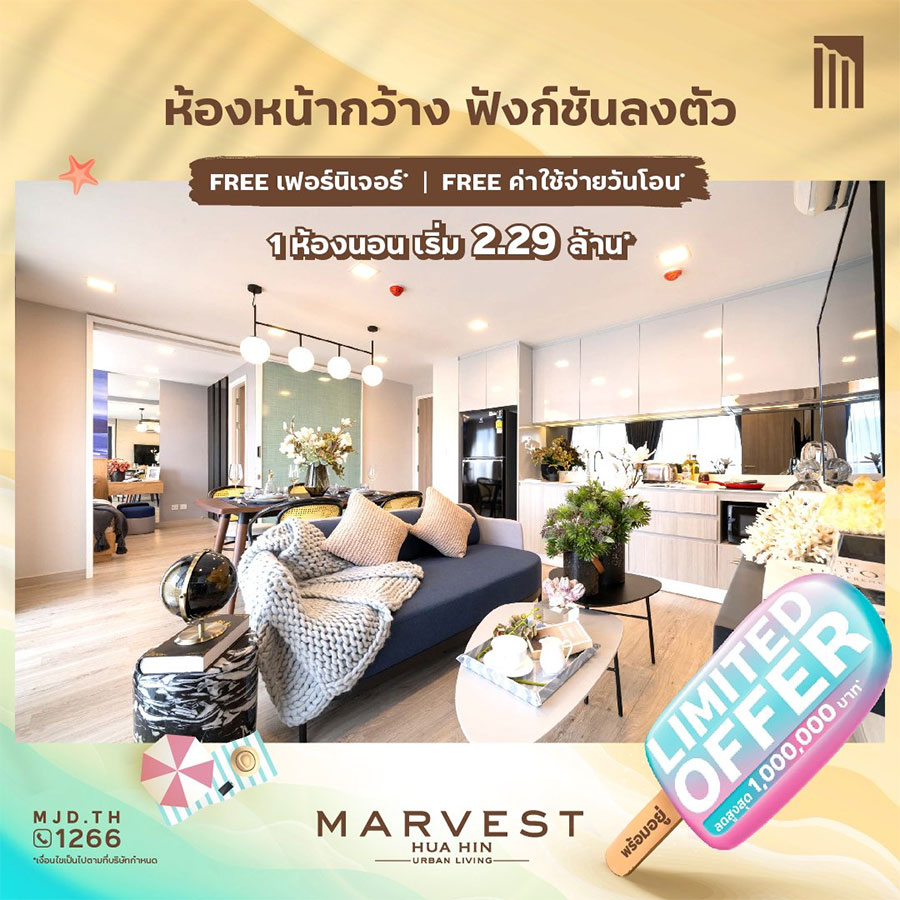 มาร์เวสท์ หัวหิน (Marvest Hua Hin) คอนโดพร้อมอยู่ ใจกลางหัวหิน ติดถนนเพรชเกษม ส่วนกลางครบ พร้อมสระว่ายน้ำยาว 50 เมตร และ jacuzzi ซื้ออยู่เองก็ดี ปล่อยเช่าก็คุ้ม ใกล้แหล่ง กินเที่ยว ช้อป เพียง 450 เมตร จากตลาดโต้รุ่งหัวหิน และ 700 เมตร จากชายหาดหัวหิน ใกล้ Market Village หัวหิน จัดโปรแรง LIMITED OFFER ลดสูงสุด 1,000,000 บาท*
