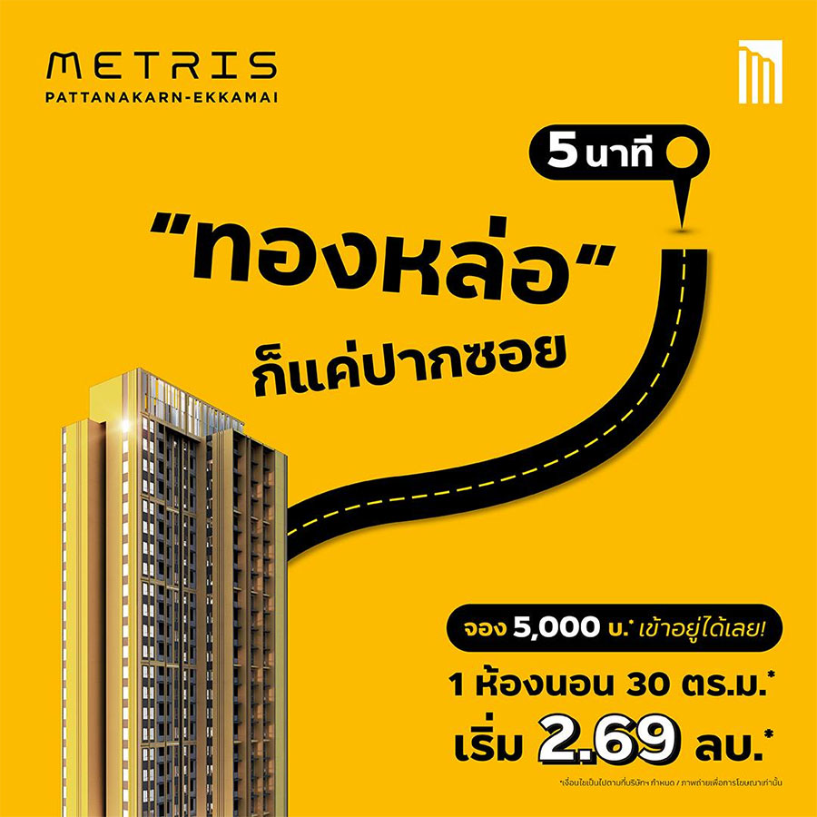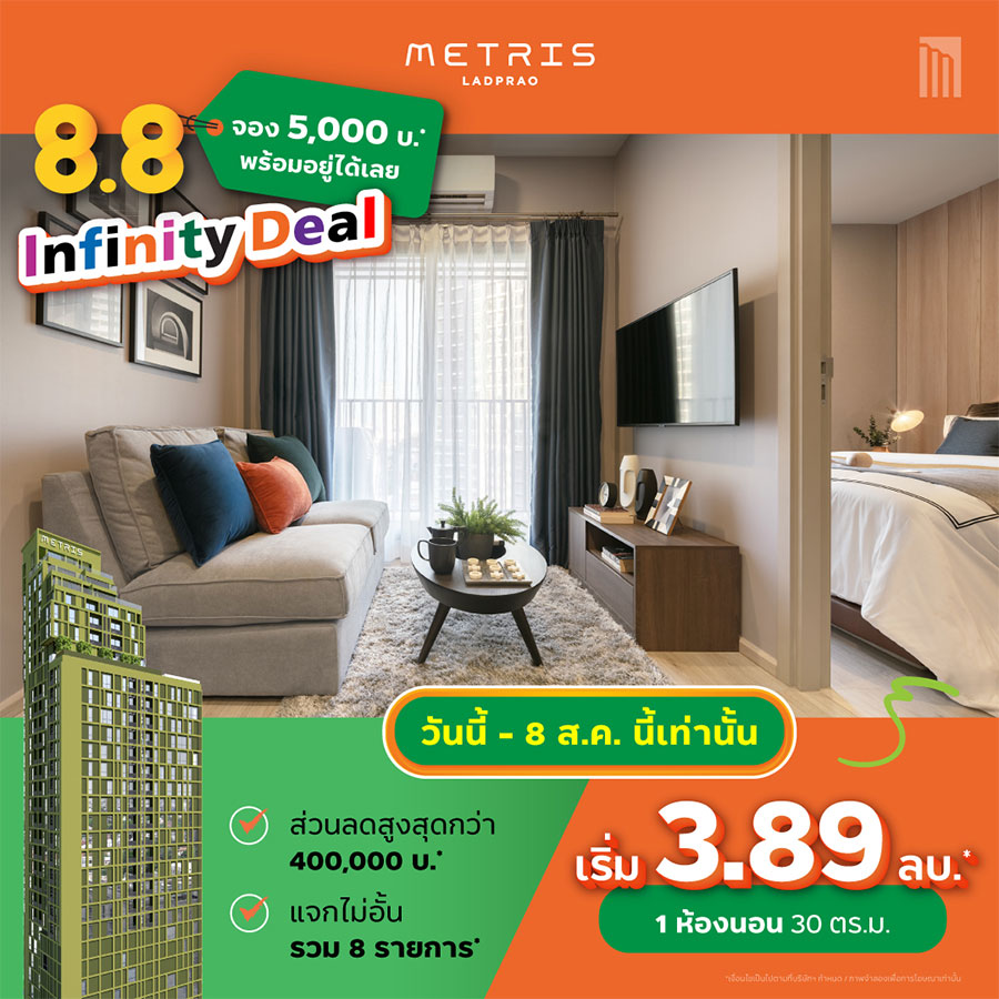เมทริส ลาดพร้าว (Metris Ladprao) จัดโปรฯ "8.8 Infinity Deal" คอนโดติดถนนใหญ่ ใกล้ MRT ยุนิตน้อยได้ความเป็นส่วนตัว เลี้ยงสัตว์ได้ จ่ายเพียง 5,000 บ.* เข้าอยู่ได้เลย พร้อมรับโปรเด็ดๆ รวมกว่า 8 รายการ