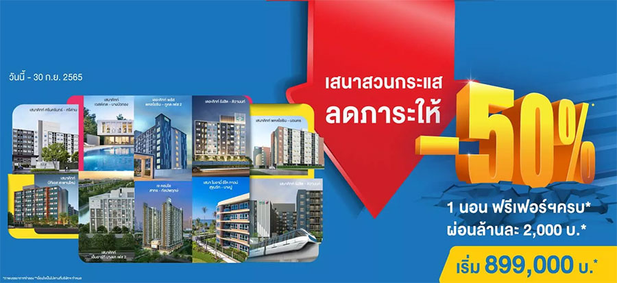 เสนาดีเวลลอปเม้นท์ ส่งแคมเปญ "เสนาสวนกระแสลดภาระ 50%" ซื้อโครงการทั้งพร้อมเข้าอยู่และโครงการอยู่ระหว่างการก่อสร้างไม่ว่าจะเป็นคอนโด,บ้านเดี่ยว,อาคารพาณิชย์ของเสนา ทั้ง 16 โครงการบนทำเลศักยภาพ ตั้งแต่วันนี้ - 30 กันยายน 2565
