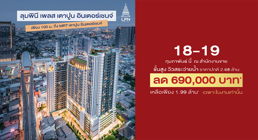 เสาร์อาทิตย์ 18-19 กุมภาพันธ์ 2566 นี้! รับราคาพิเศษ ที่ สำนักงานขาย ลุมพินี เพลส เตาปูน อินเตอร์เชนจ์ คอนโดมิเนียมใหม่ พร้อมอยู่ เพียง 100 ม. ถึงรถไฟฟ้า MRT สถานีเตาปูน อินเตอร์เชนจ์ คอนโดชั้นสูง วิวสระ จากราคาปกติ 2.68 ล้าน* ลด 690,000 บาท เหลือเพียง 1.99 ล้าน*