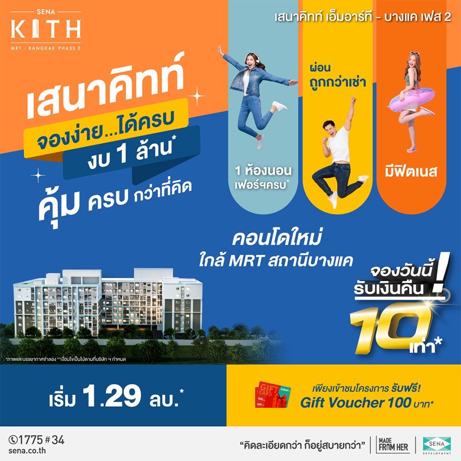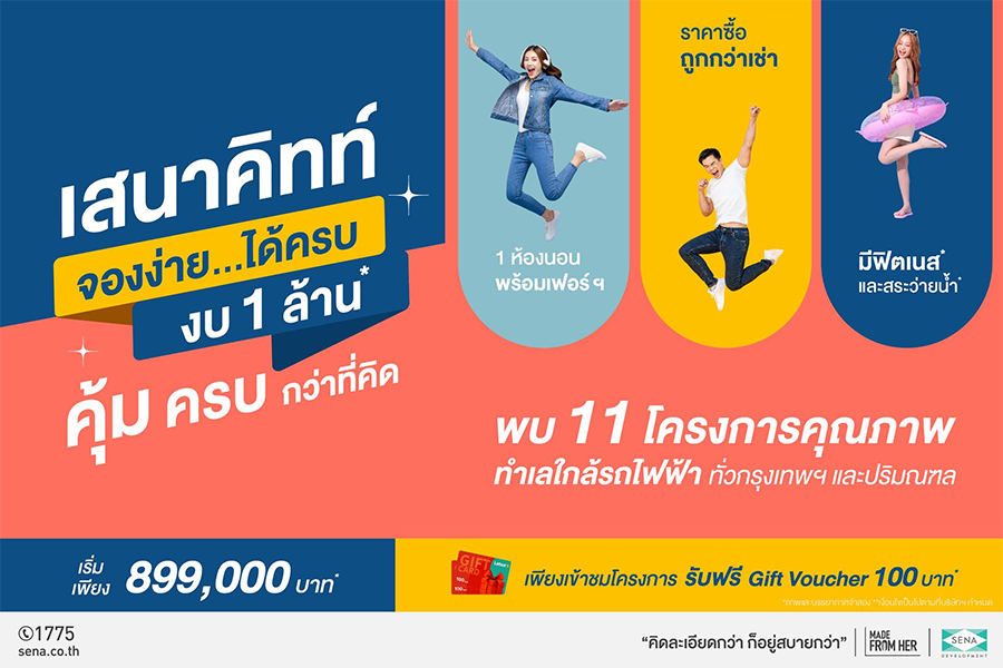 คอนโดเสนาคิทท์ จองง่าย ได้ครบ งบ 1 ล้าน* คุ้ม ครบกว่าที่คิด กับคอนโดเสนาคิทท์ 11 โครงการคุณภาพ ทำเลใกล้รถไฟฟ้า ทั่วกรุงเทพฯ และปริมณฑล พิเศษ! เพียงแวะชมโครงการเสนาคิทท์ รับฟรีทันที Gift Voucher มูลค่า 100 บาท!