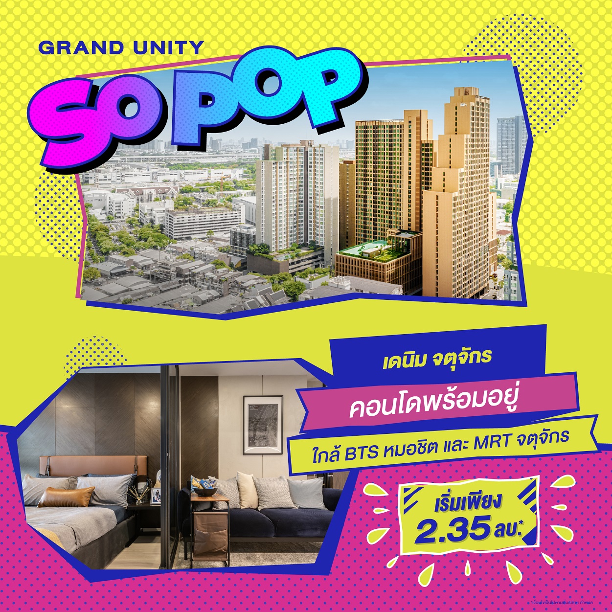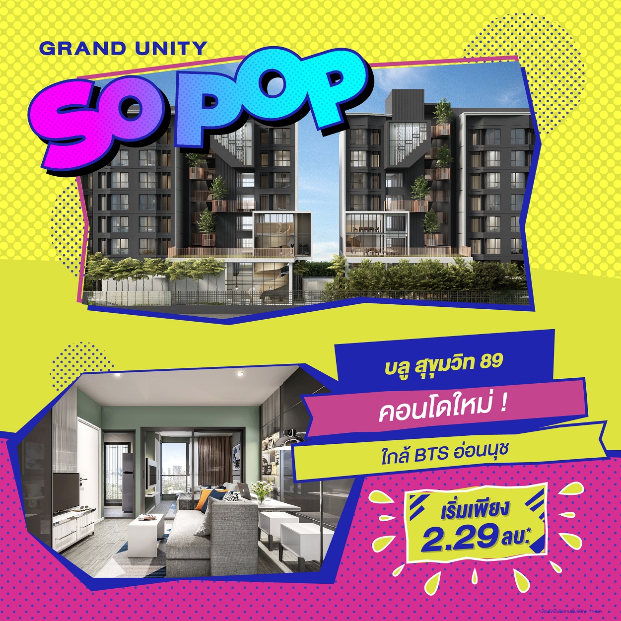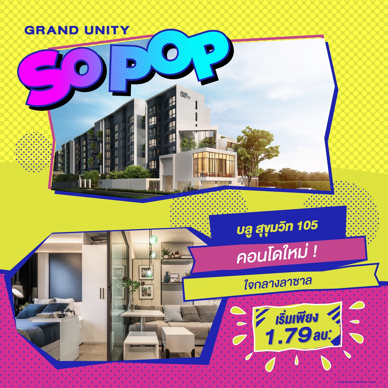 บริษัทฯ ได้เล็งเห็นโอกาสที่ดีสำหรับผู้บริโภคที่มีความพร้อมในการซื้อที่อยู่อาศัย จึงได้ขนทัพคอนโดมิเนียมบนทำเลคุณภาพ กับ 8 โครงการสุดป็อบ แป๊บเดียวถึงรถไฟฟ้า ร่วมออกบูธภายในงาน "มหกรรมบ้านและคอนโด ครั้งที่ 43" ที่มีกำหนดจัดขึ้นในวันที่ 23 - 26 มีนาคม ณ ฮอลล์ 5 ศูนย์ประชุมแห่งชาติสิริกิติ์ พร้อมจัดแคมเปญโปรโมชันพิเศษ "GRAND UNITY SO POP" มอบข้อเสนอสุดป็อป 5 ต่อ เพียงจองภายในงานต่อที่ 1 ส่วนลดพิเศษสูงสุดถึง 1 ล้านบาท*
