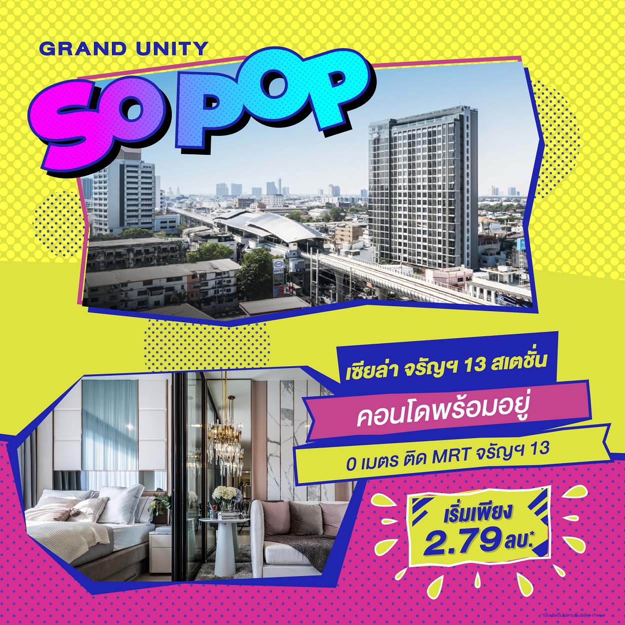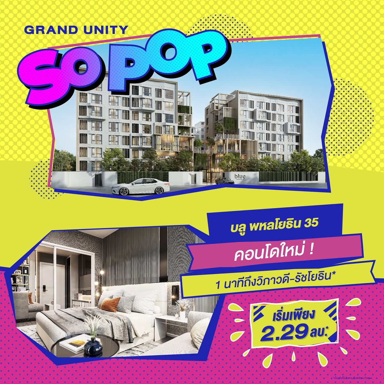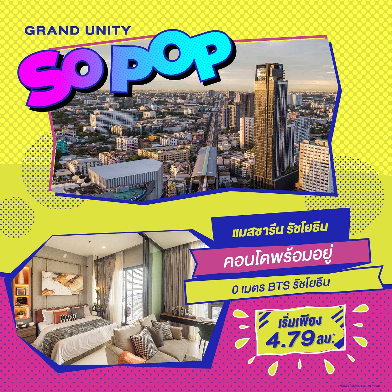 บริษัทฯ ได้เล็งเห็นโอกาสที่ดีสำหรับผู้บริโภคที่มีความพร้อมในการซื้อที่อยู่อาศัย จึงได้ขนทัพคอนโดมิเนียมบนทำเลคุณภาพ กับ 8 โครงการสุดป็อบ แป๊บเดียวถึงรถไฟฟ้า ร่วมออกบูธภายในงาน "มหกรรมบ้านและคอนโด ครั้งที่ 43" ที่มีกำหนดจัดขึ้นในวันที่ 23 - 26 มีนาคม ณ ฮอลล์ 5 ศูนย์ประชุมแห่งชาติสิริกิติ์ พร้อมจัดแคมเปญโปรโมชันพิเศษ "GRAND UNITY SO POP" มอบข้อเสนอสุดป็อป 5 ต่อ เพียงจองภายในงานต่อที่ 1 ส่วนลดพิเศษสูงสุดถึง 1 ล้านบาท*