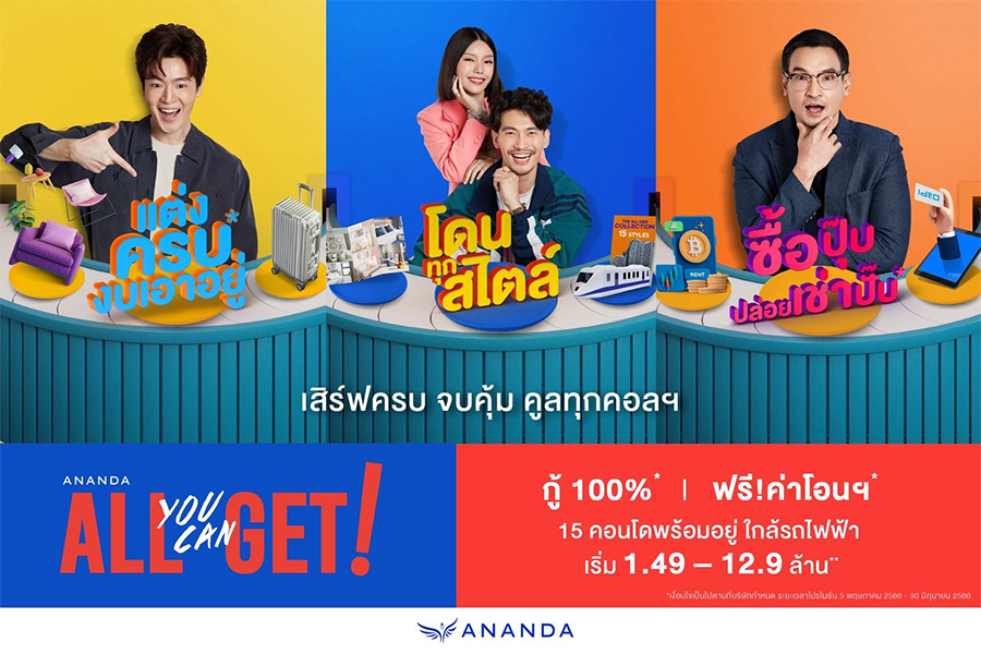 แคมเปญ "Ananda All You Can Get" เสิร์ฟครบ จบคุ้ม คูลทุกคอลฯ ได้ครบ ได้คุ้ม ได้ตรงปก ได้ห้องคอลเลกชั่นใหม่ ตกแต่งครบ* พร้อมโปรโมชั่น "กู้ 100%* ฟรีค่าโอนฯ" กับ 15 คอนโดมิเนียมพร้อมอยู่ติดรถไฟฟ้า