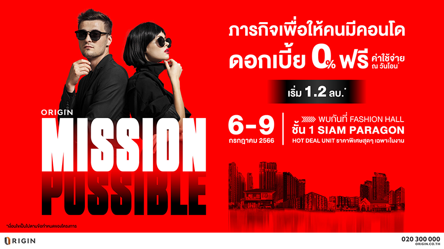 ออริจิ้น พร็อพเพอร์ตี้ ผู้พัฒนาอสังหาริมทรัพย์ครบวงจร จัดแคมเปญภารกิจเพื่อให้คนมีคอนโด ในงาน ORIGIN MISSION POSSIBLE ยกทัพโครงการคอนโดมิเนียมในเครือออริจิ้น ทั้งพร้อมอยู่และพรีเซล บนทำเลศักยภาพทั่วกรุงเทพฯ และต่างจังหวัด มีให้เลือกกว่า 30 โครงการ ราคาเริ่ม 1.2 ล้านบาท*