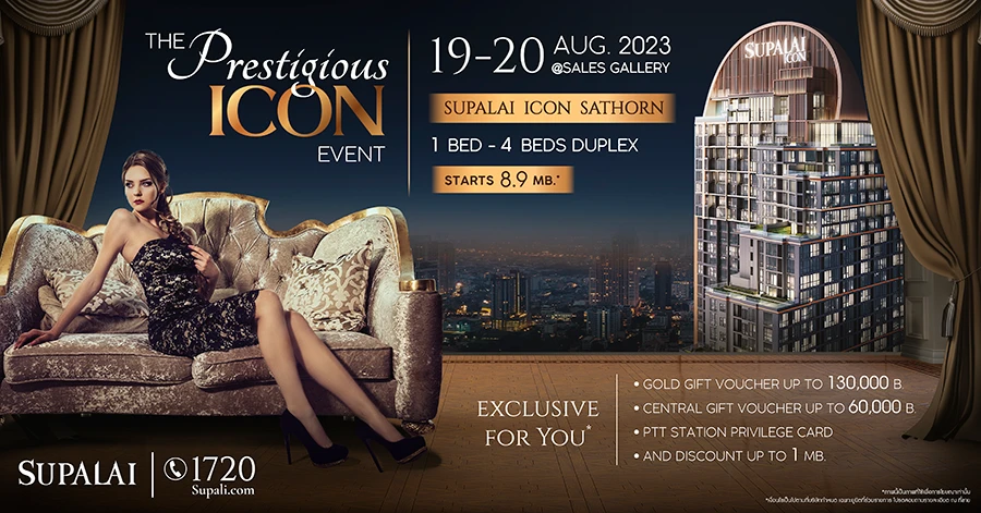 ศุภาลัย ไอคอน สาทร ที่สุดแห่งโครงการ Luxury Class เอกอัครสถานแห่งถนนสาทร อาณาจักรแห่งความสุข และความสำเร็จ โครงการหรูระดับตัวท็อปที่สุดของศุภาลัย ที่มีการพูดถึงเป็นอย่างมาก พร้อมตอบรับทุกความต้องการ ให้คุณเป็นเจ้าของที่อยู่อาศัยบนทำเลศักยภาพ ยกระดับไลฟ์สไตล์การใช้ชีวิตที่เหนือระดับ พร้อมสัมผัสความเรียบหรู กับรูปแบบห้องพักที่หลากหลาย 1 - 4 ห้องนอน ขนาด 42 – 350 ตารางเมตร โดดเด่นกับฟังก์ชัน และเน้นพื้นที่ใช้สอยได้อย่างลงตัว พร้อมวัสดุภายในห้องจากแบรนด์ชั้นนำที่มีคุณภาพ ในราคาเริ่มเพียง 8.9 ล้านบาท* พร้อมรับข้อเสนอสุดเอ็กซ์คลูซีฟ เฉพาะเมื่อจองภายในวันงาน “The Prestigious Icon Event” วันที่ 19-20 สิงหาคม 2566 โดยลูกค้าจะได้รับบัตรกำนัลทอง มูลค่าสูงสุด 130,000 บาท* บัตรกำนัลเซ็นทรัล มูลค่าสูงสุด 60,000 บาท* บัตรเติมน้ำมัน ปตท. มูลค่า 10,000 บาท* พร้อมรับส่วนลดสูงสุดถึง 1 ล้านบาท* (*เงื่อนไขเป็นไปตามที่บริษัทกำหนด) พิเศษ! สำหรับลูกค้าที่ลงทะเบียนก่อนวันงานและมาร่วมงาน รับฟรี! บัตร Starbucks มูลค่า 200 บาท (จำนวนจำกัด)