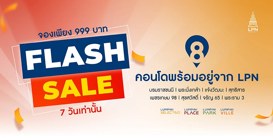 บริษัท แอล.พี.เอ็น.ดีเวลลอปเมนท์ จำกัด (มหาชน) ผู้พัฒนาที่พักอาศัยคุณภาพที่มาพร้อมกับความ น่าอยู่ในทุกมิติ เพื่อยกระดับรูปแบบการใช้ชีวิตที่ดีที่สุดมามากกว่า 34 ปี เดินหน้าสร้างความสุขให้กับลูกค้าอย่างต่อเนื่อง กับโปรโมชั่นเด็ดฉลองเดือน9 ‘Flash Sale’ คัด 8 โครงการคอนโดทำเลดี พร้อมอยู่ราคาโดนใจจาก LPN มอบส่วนลด! ของแถม! พร้อมรับสิทธิพิเศษต่างๆมากมาย เพียงจอง 999 บาท ทำสัญญาและโอนกรรมสิทธิ์ ตั้งแต่วันนี้ - 29 ก.ย. 66 นี้เท่านั้น! (*เงื่อนไขเป็นไปตามที่บริษัทฯ กำหนด)