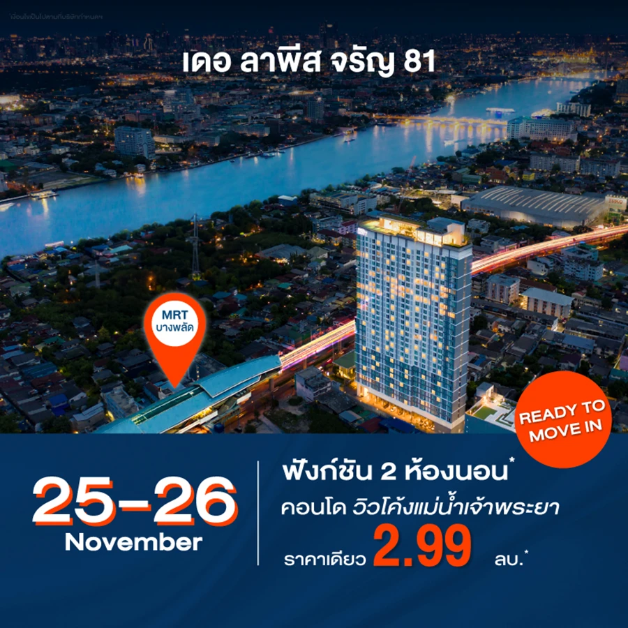 แกรนด์ ยูนิตี้ เตรียมจัดโปรโมชั่นสุดพิเศษ สำหรับห้องใหญ่ ฟังก์ชัน 2 ห้องนอน* กับโครงการ เดอ ลาพีส จรัญ 81 (De LAPIS Charan 81) คอนโดมิเนียมพร้อมอยู่ วิวโค้งแม่น้ำเจ้าพระยา ติด MRT บางพลัด ในราคาเพียง 2.99 ล้านบาท* พร้อมพบข้อเสนอสุดพิเศษมากมาย และลุ้นรับของรางวัลมูลค่ารวมกว่า 400,000 บาท* เฉพาะในงานวันที่ 25 - 26 พฤศจิกายนนี้ เท่านั้น