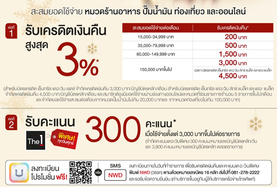 ใกล้จะสิ้นปีแล้ว...ใครที่กำลังมองหาโปรฯ ดีๆ ก็ต้องแคมเปญนี้เลยค่ะ “เที่ยวกินฟินช้อป” ที่มีมาแจกความคุ้มให้กันแบบข้ามปีกันเลยทีเดียว (1 ธ.ค. 64 – 28 ก.พ. 65) กับแคมเปญรับเครดิตเงินคืนสูงสุด 3% + รับคะแนนเดอะวัน 300 คะแนน* เมื่อสะสมยอดใช้จ่ายในหมวดร้านอาหาร ปั๊มน้ำมัน ช่องทางออนไลน์ และท่องเที่ยว ซึ่งรวมถึงสายการบิน โรงแรม บริษัททัวร์ และรถเช่า (ตามเงื่อนไขที่กำหนด)