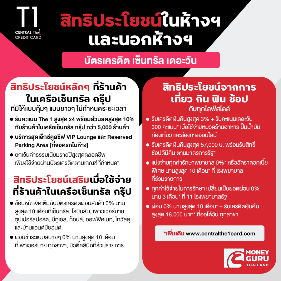 “บัตรเครดิต เซ็นทรัล เดอะวัน” เป็นบัตรเครดิตมาสเตอร์การ์ด บัตรใบนี้มีความพิเศษที่ทำให้ทางทีมงาน CheckRaka เลือกมาแนะนำ และนำเสนอเพื่อนๆ ก็ด้วยความฟิน ความคุ้มค่า จากการใช้บัตรใบนี้ใบเดียว ตามสโลแกนที่ว่า “เที่ยว กิน ฟิน ช้อป” แต่ก่อนอื่นเลย ทางทีมงานอยากจะบอกเพื่อนๆ ว่า จากที่หลายคนเข้าใจผิดว่า “บัตรเครดิต เซ็นทรัล เดอะวัน” นั้น สามารถใช้งานได้แค่ที่ห้างฯ เท่านั้น เป็นความคิดที่ผิดโดยสิ้นเชิงค่ะ เพราะบัตรฯ ใบนี้มีสิทธิประโยชน์อื่นอีกมากมาย ทั้งในห้างฯ และนอกห้างฯ ซึ่งการใช้จ่ายในห้างนั้นก็ว่าคุ้มมากแล้ว แต่การใช้จ่ายนอกห้างฯ ของบัตรฯ ใบนี้ก็คุ้มค่าเช่นกันค่ะ มาถึงตอนนี้หลายคนคงอยากจะรู้แล้วใช่มั้ยคะว่า “บัตรเครดิต เซ็นทรัล เดอะวัน” มีสิทธิประโยชน์อะไรบ้าง? และคุ้มค่ายังไง? มาดูไปพร้อมกันเลยค่ะ