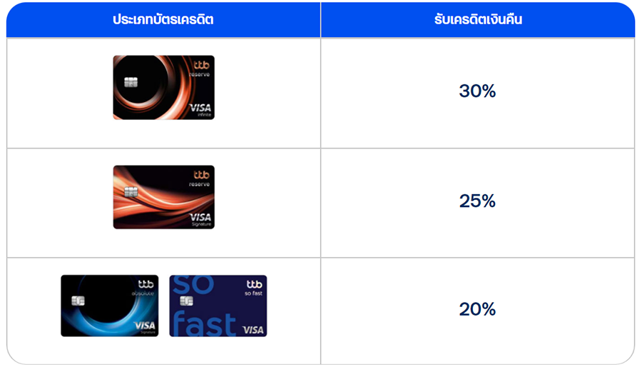 - สิทธิพิเศษนี้เฉพาะผู้ถือบัตรเครดิต ทีทีบี บัตรเครดิตทีเอ็มบี และบัตรเครดิตธนชาต เฉพาะบัตรเครดิตประเภทที่มีคะแนนสะสม และต้องเป็นบัตรหลักเท่านั้น