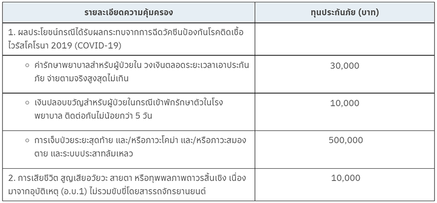 - สิทธิพิเศษนี้ใช้เฉพาะการเจ็บป่วยด้วยภาวะหรือโรคร้ายแรง จากกรณีได้รับผลกระทบในการฉีดวัคซีนป้องกันโรคติดเชื้อไวรัสโคโรนา 2019 เท่านั้น รับประกันภัยโดย บริษัท กรุงเทพประกันภัย จำกัด (มหาชน)